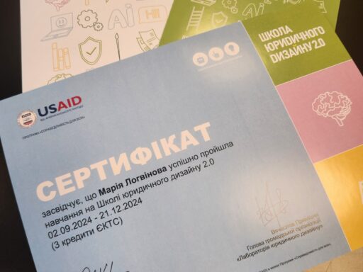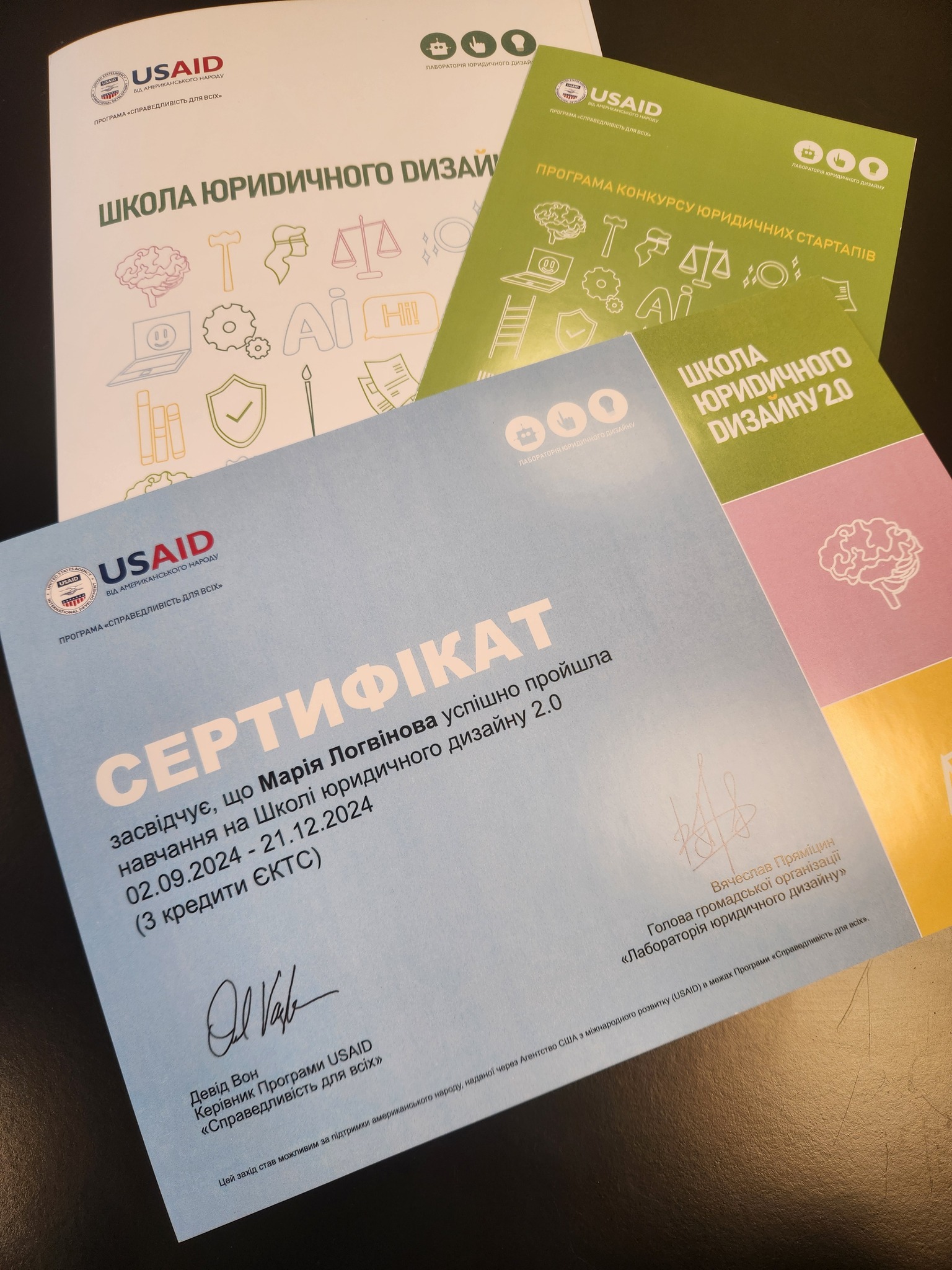 Адвокатка Марія Логвінова опанувала сертифікатну програму від ГО «Лабораторія юридичного дизайну» Школа юридичного дизайну 2.0. Програма тривала впродовж 4 місяців (вересень-грудень 2024 року).